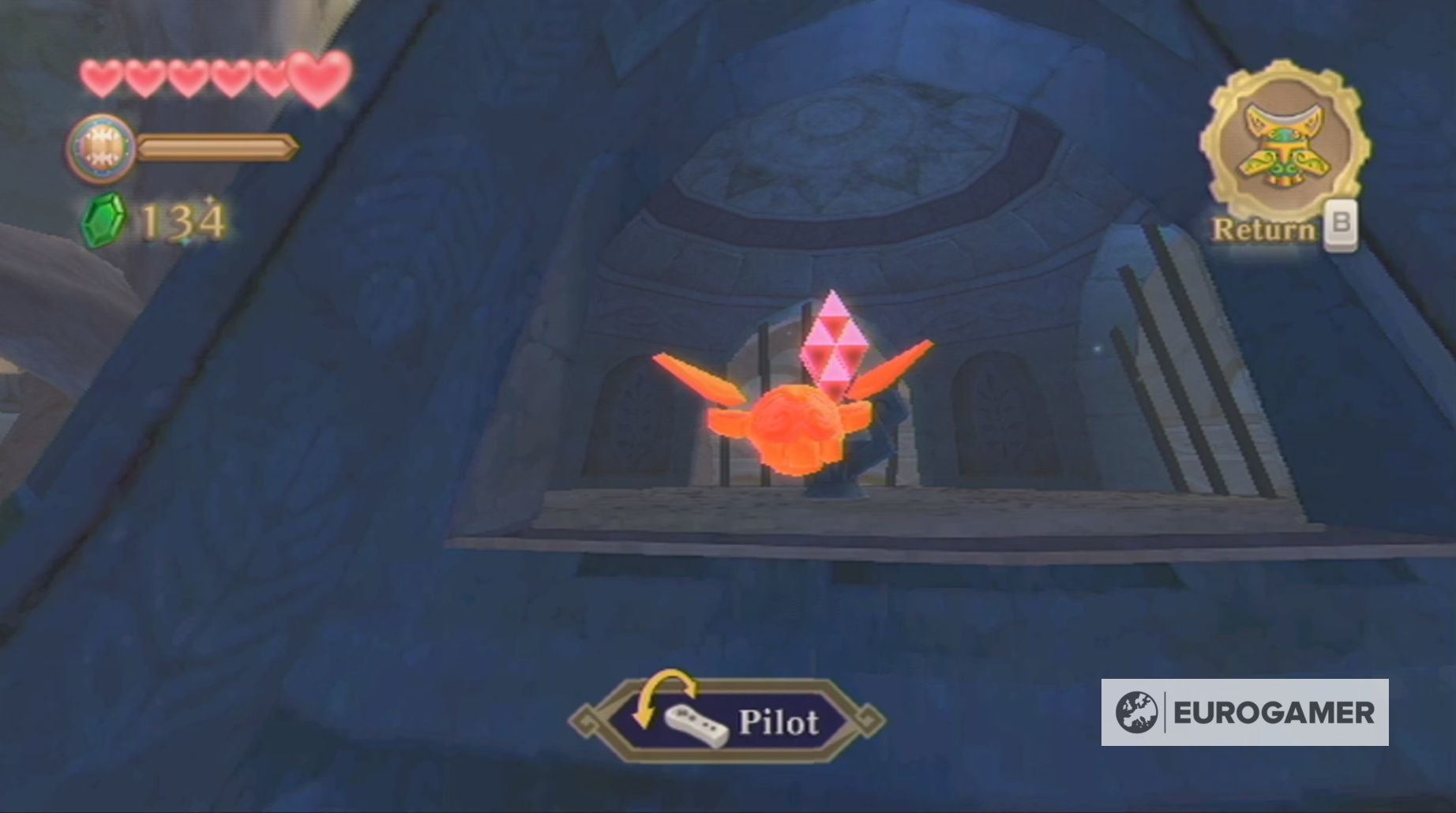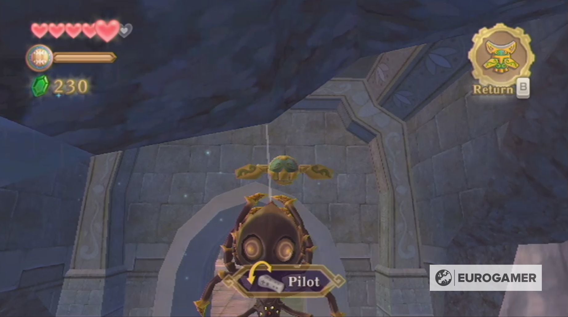 Het is een goed idee om wat tijd te besteden aan het wennen aan de besturing van de Kever, want dit deel van de kerker zit vol met kleine nisjes die je alleen met de Kever kunt bereiken. Er zijn Rupees te vinden, en als je de Kever gebruikt om de edelsteen bovenin de koepel te raken, vind je zelfs een Hartstukje.