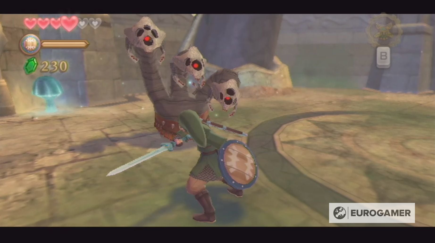 In deze nieuwe kamer staat een Staldra op je te wachten. Om dit hydra-achtige beest te verslaan, moet je al zijn koppen tegelijk afhakken. Dat doe je door de zwaai van Links zwaard af te stemmen op de stand van de hoofden; als de hoofden bijvoorbeeld horizontaal zijn gepositioneerd, dan moet je je zwaard horizontaal zwaaien.