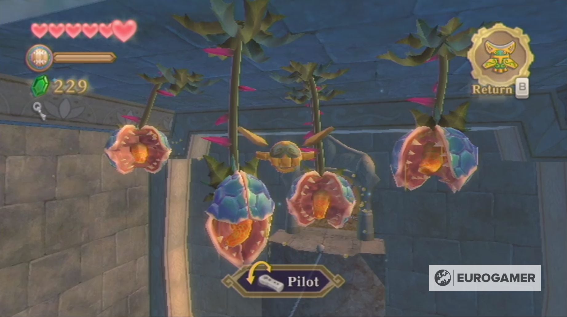 Om de baas sleutel voor de Tempel der Bezinning in Skyward Sword te vinden, moet je eerst naar de rechterkant van de koepelkamer gaan en de Kever gebruiken om de Deku Baba's te doden die aan het plafond hangen. Dat stelt je in staat om veilig over het koord te lopen en de deur te openen.