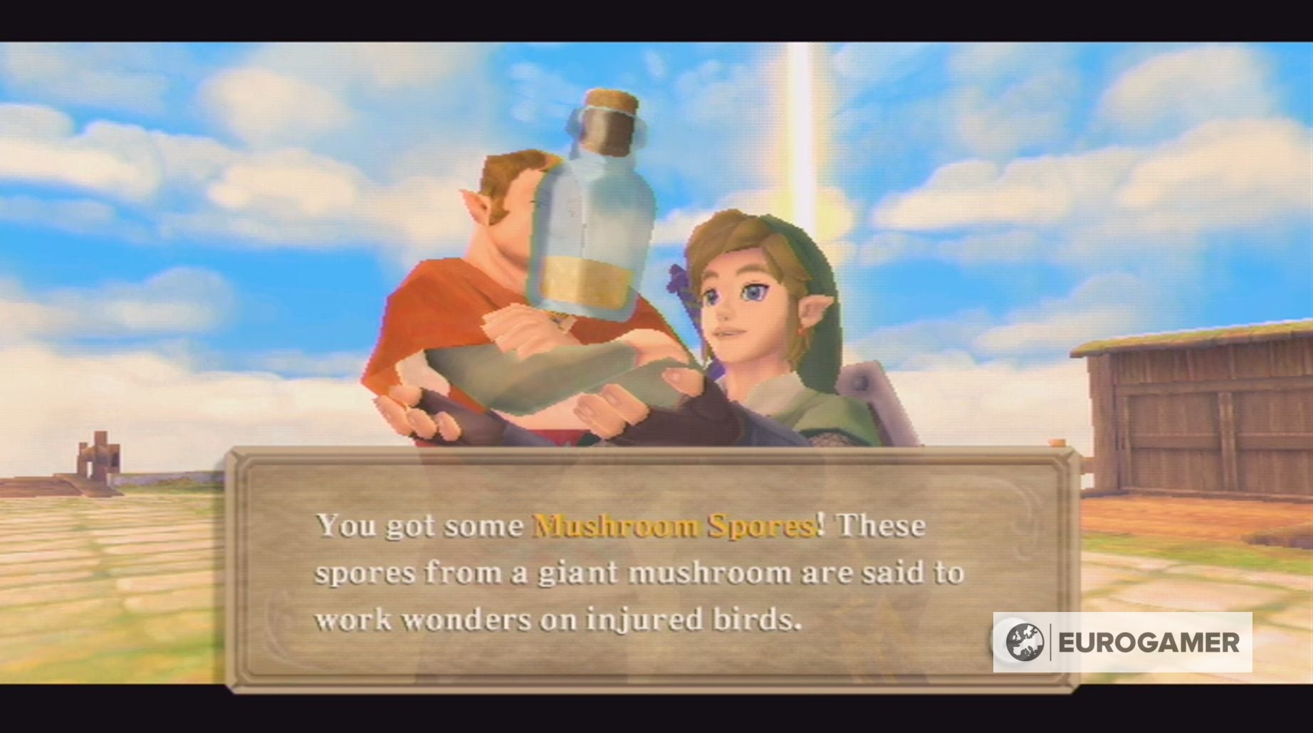 Dat betekent dat je terug moet gaan naar Skyloft en met Couw moet praten. Hij geeft je een fles met medicijnen voor Alba's vogel en het beste van alles is dat je de fles mag houden. Hoera!