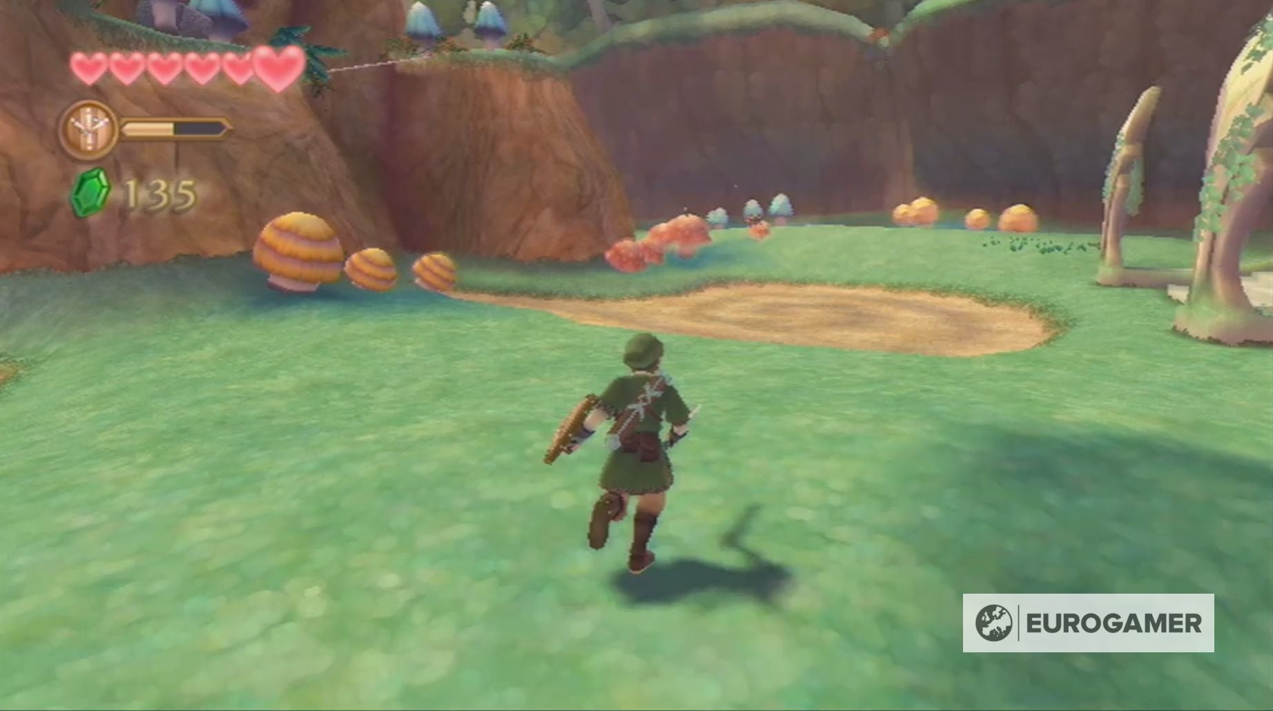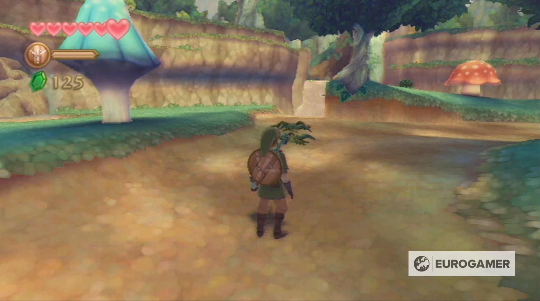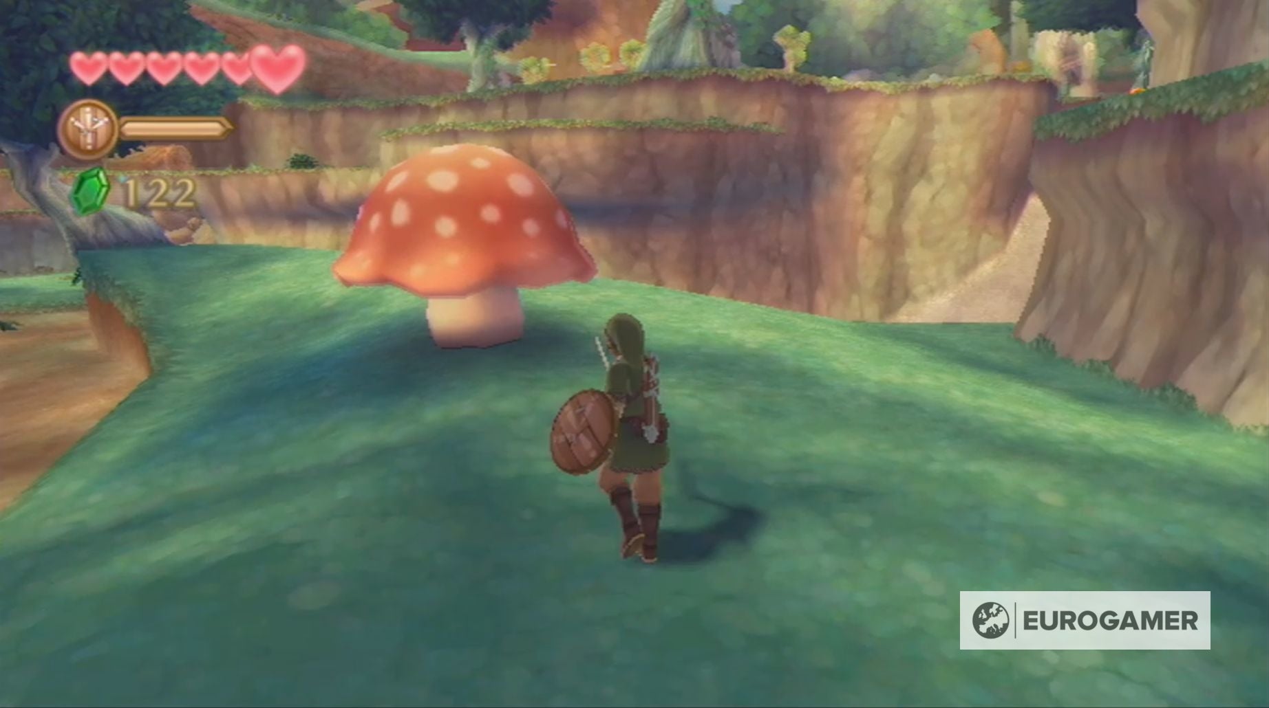Je bereikt zo al snel het open gedeelte van het Faron-woud, waar de Kikwi zich zal verstoppen achter de rode paddenstoel links van je pad. Rol tegen de paddestoel of gebruik je zwaard en de Kikwi zal opnieuw wegrennen.