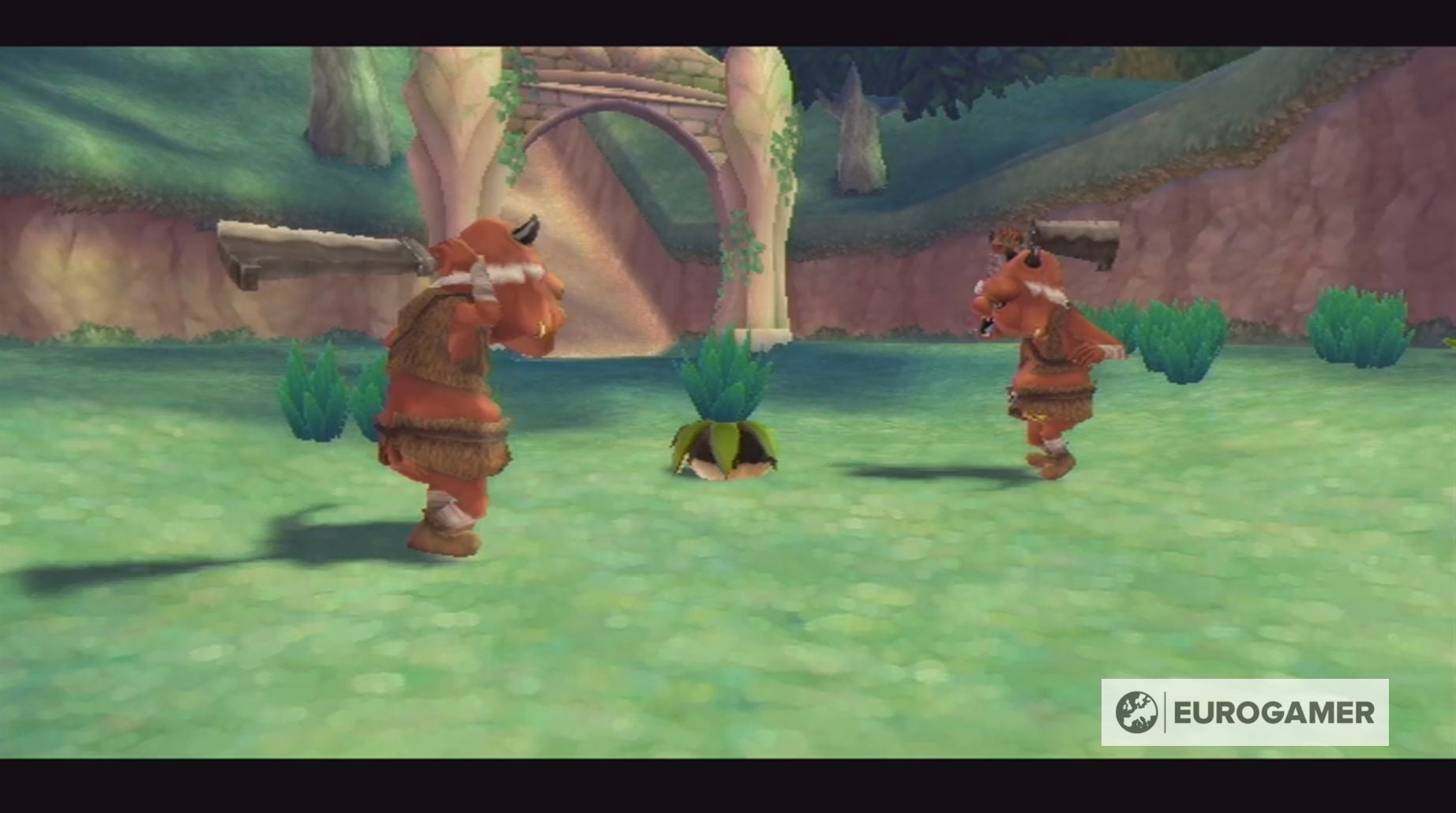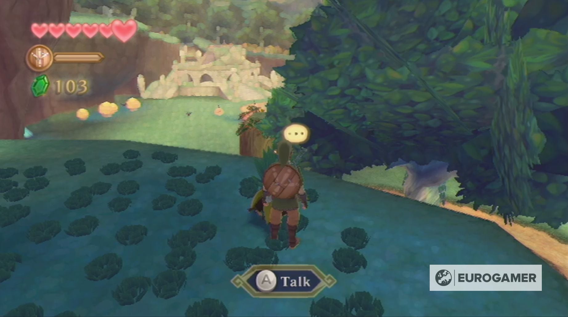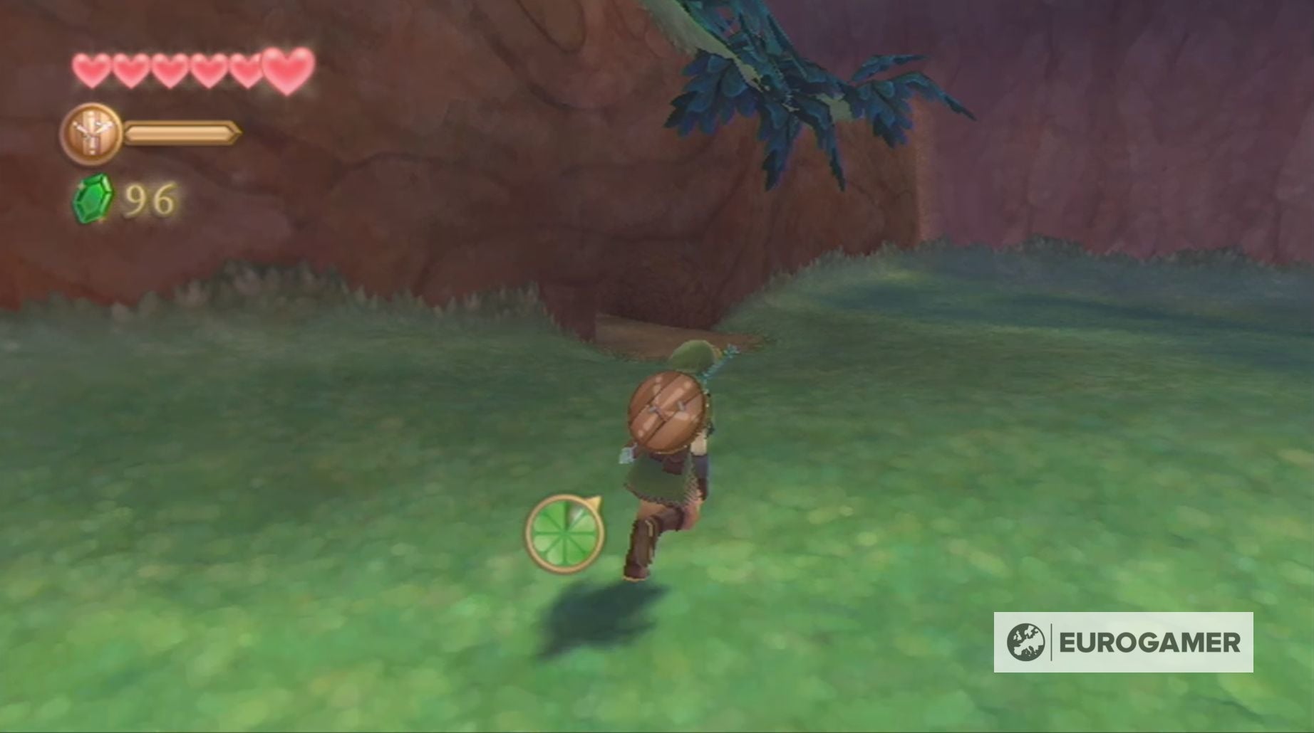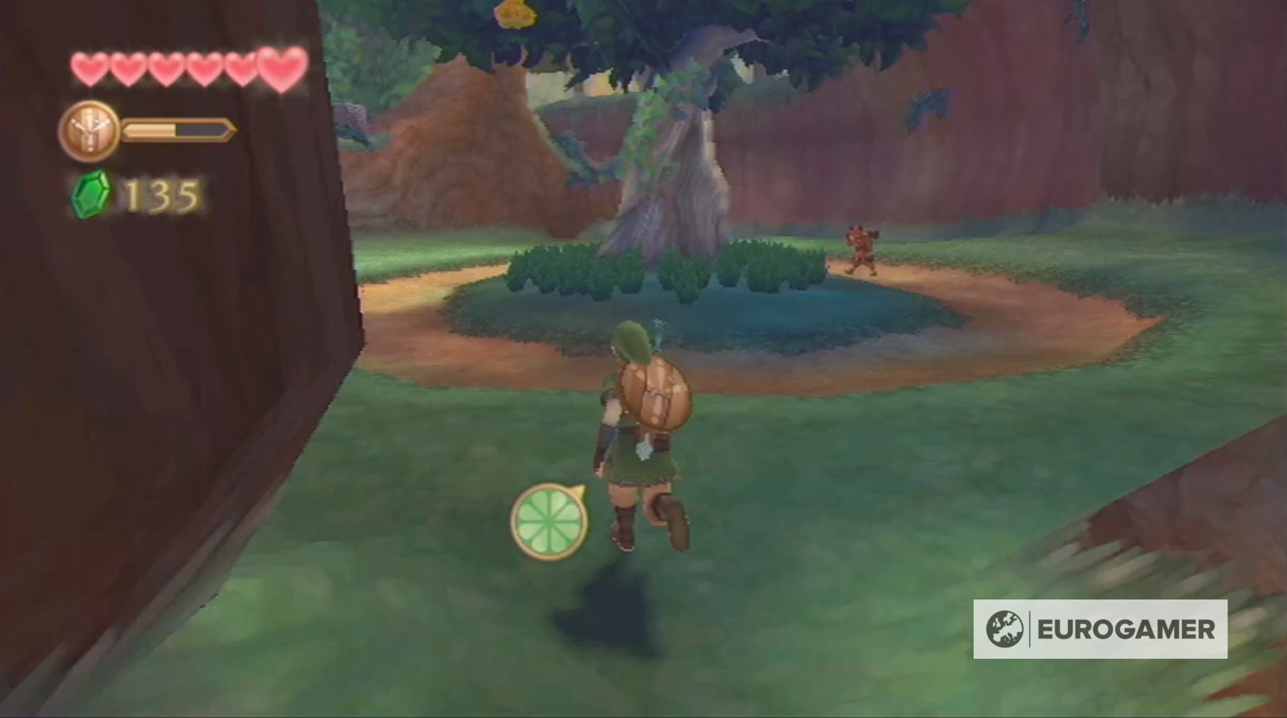 Je bereikt zo al snel het open gedeelte van het Faron-woud, waar de Kikwi zich zal verstoppen achter de rode paddenstoel links van je pad. Rol tegen de paddestoel of gebruik je zwaard en de Kikwi zal opnieuw wegrennen.
