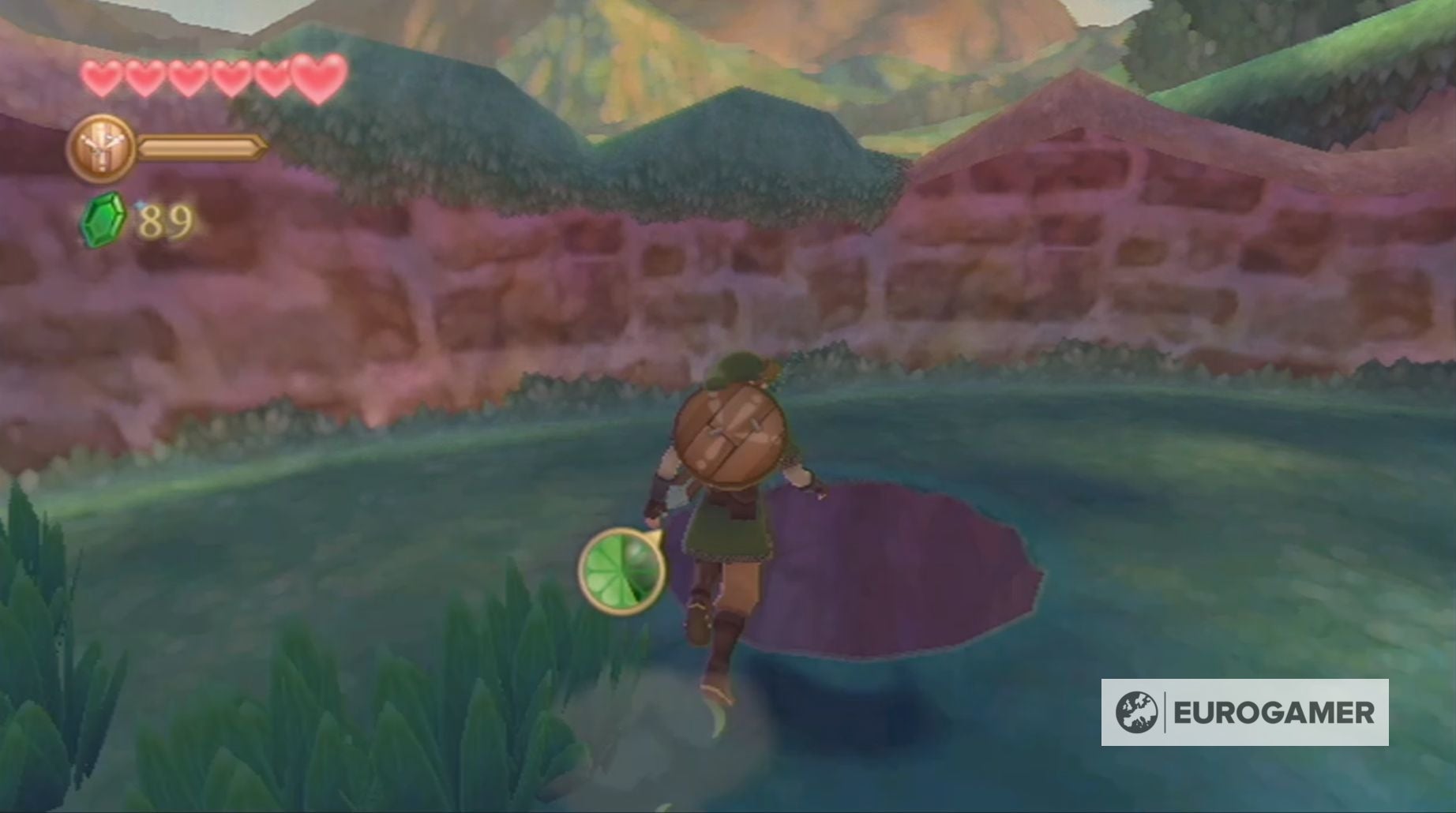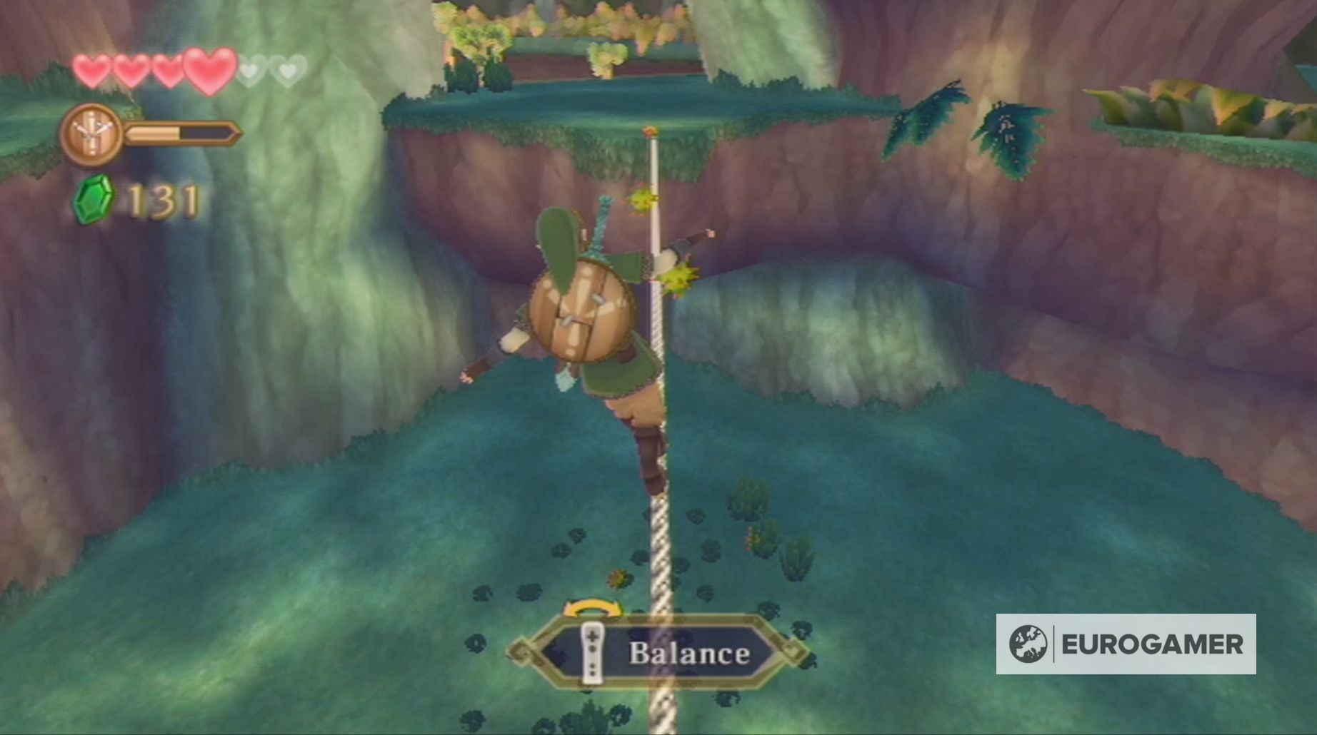 Hier links kan je trouwens je eerste hartstukje vinden - je moet enkel over het touw wandelen zoals daarnet. Als je vier hartstukjes verzameld, krijg je een extra hartje in Skyward Sword. Grijp deze dus zodra je ze ziet want ze komen ontzettend van pas.