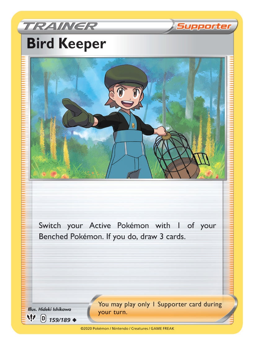 Bird Keeper is een Supporter card die je toelaat om je actieve Pokémon met eentje op je bench te wisselen én drie nieuwe kaarten uit je deck te trekken. Dat zorgt voor interessante mogelijkheden in combinatie met andere kaarten in je deck.